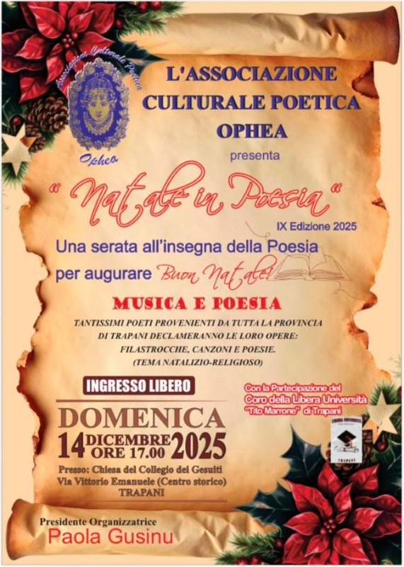 Tantissimi poeti provenienti dalla Provincia di Trapani declameranno le loro opere: filastrocche, canzoni e poesie in lingua italiana e siciliana in tema Natalizio Religioso.